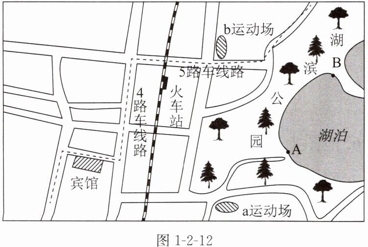 11. [江苏徐州沛县阶段检测]小徐暑假和家人去旅游,在出发前小徐找到他们目的地的城市交通图,做了一个旅游攻略。读图1-2-12,回答下列问题。(5 分)