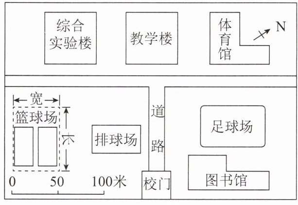 10.A 【解析】根据图中比例尺,图上1厘米代表实地距离50米,通过测量可知,篮球场的图上宽度约为1厘米,所以实地宽度约为50米。故选A。