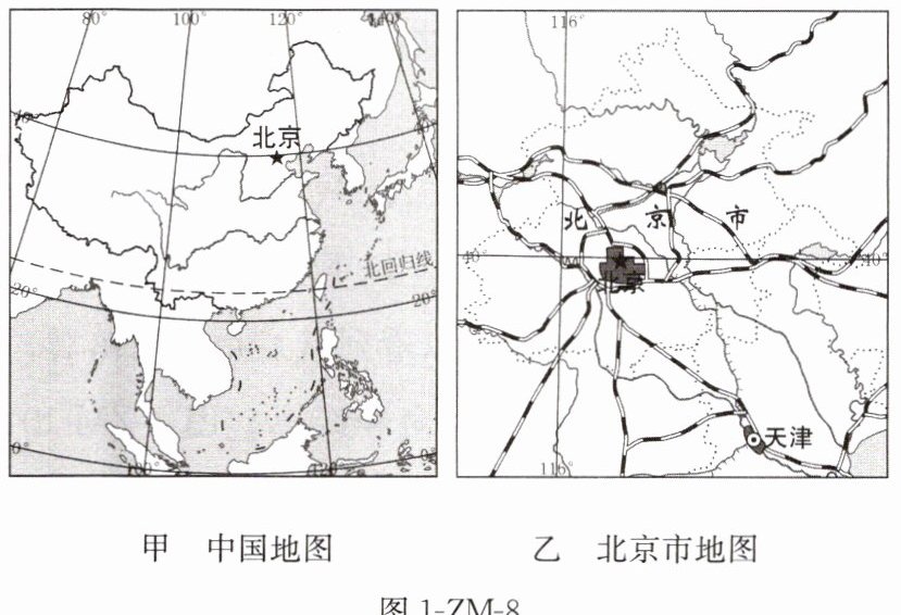 图1-ZM-8中的甲、乙分别为中国地图、北京市地图。读图,回答8~10题。
