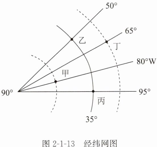 9.C 【解析】从经纬网图中可以看出,图中经度为西经度,逆时针方向经度数值减小,说明为向东的方向,由此可知该图是北半球的经纬网图,丁地位于北回归线,所以纬度是23.5°N,经度是65°W。故选 C。