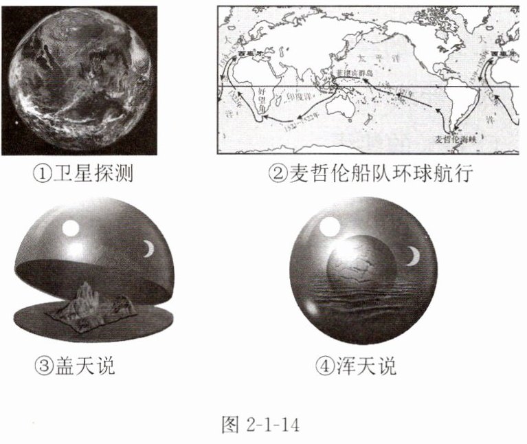 人类对地球形状的认识,经历了漫长而艰难的探索过程。图 2 - 1 - 14 示意人类探索地球形状的过程。据此回答 1、2 题。
