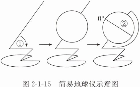 地理实践活动要培养每个学生的动手操作能力,给学生自主设计和实施活动方案的机会。图 2 - 1 - 15 为某同学用铁丝、乒乓球制作的简易地球仪示意图。读图,回答 3~5 题。