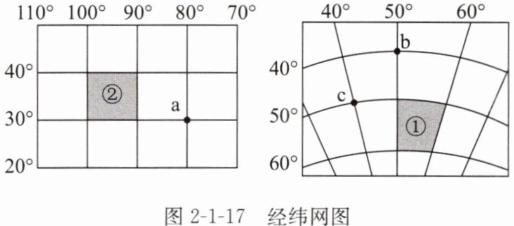 图 2 - 1 - 17 为两幅经纬网图。读图,回答 8~10 题。