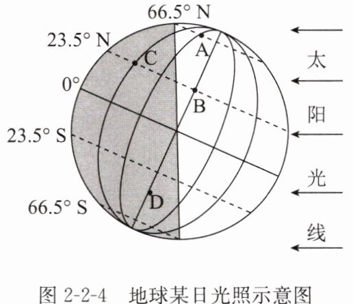 中国古代劳动人民在数千年的历史发展中形成了日出而作,日落而息,顺应天时的生存法则。读地球某日光照示意图(图 2 - 2 - 4),回答 1~3 题。