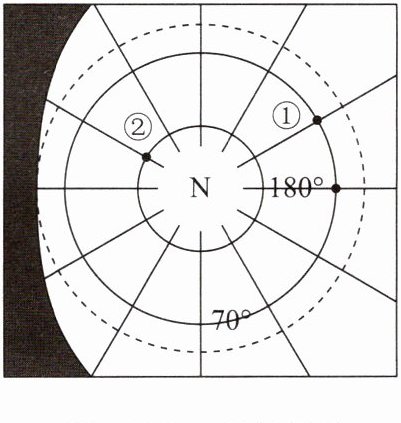 3. B 【解析】读图可知,图中显示北极地区出现极昼现象,此时太阳直射北回归线,日期为 6 月 22 日前后,北半球节气为夏至,北半球昼长夜短。故选 B。4. D 【解析】读图分析可知,此图为北半球俯视图,每条经线间隔 30°。从北极上空看,地球按逆时针方向旋转,180°经线以东为西经,以西为东经,据此可判断图中①地所在的地理坐标是(70°N,150°W)。故选 D。5. B 【解析】根据图中字母“N”可知,此图为北半球俯视图,N 表示北极点,是地球的最北端。依据地球自西向东旋转,可判断图中②地位于①地的东北方向。故选 B。