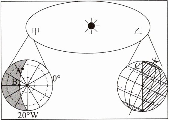 D 【解析】读图可知,甲地为夏至日,北极圈及其以北地区出现极昼现象,则左下图为北半球的光照图,地球自转方向为逆时针,A 错误;按照逆时针方向,A 点在 B 点的西方,同时 B 点比较靠近北极点,所以 A 点在 B 点的西南方向,B 错误;乙处的光照图中,北极圈内出现极夜,C 错误;根据“左昏右晨”规律,太阳由左边照射过来,C 点所在的是昏线,C 点正在日落,D 正确。故选 D。