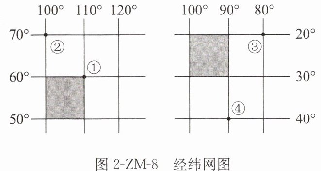 经纬网地图在军事、航空航海等方面作用巨大,利用它,我们可以确定地球表面上任意地点的地理位置。读经纬网图(图2-ZM-8),回答3、4题。
