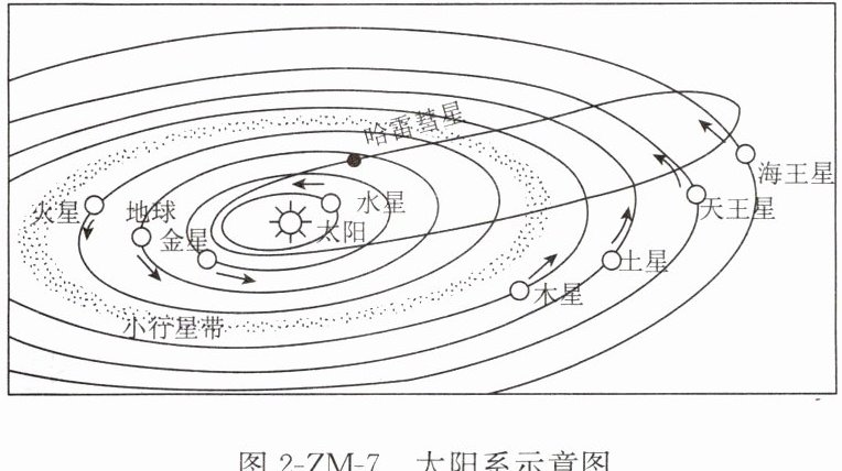 地球在太阳系中的位置适中,拥有适宜生命存在的条件,这使得地球成为宇宙中一个独特且珍贵的天体。读太阳系示意图(图2-ZM-7),回答1、2题。