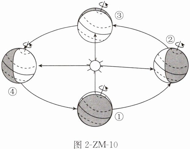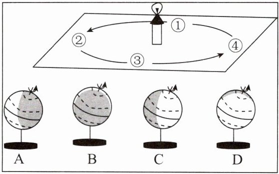 (1)图2-ZM-11所示A、B、C、D四个地球仪,表示地球在公转轨道的不同位置时的光照情况,图中阴影部分表示黑夜。请你判断A地球仪对应在地球公转轨道的______(填序号)位置。