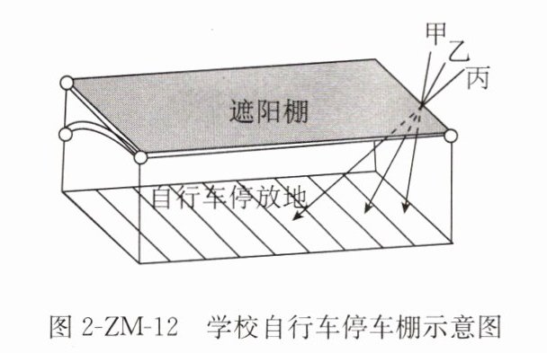 11. 昆明某中学的师生开展了不同季节正午太阳高度对学校自行车停车棚遮阳面积影响的探究活动。图2-ZM-11为地球公转示意图,图中灯泡代表太阳,地球仪代表地球,图2-ZM-12为学校自行车停车棚示意图,图中箭头甲、乙、丙代表该校二分二至日的正午太阳光线。读图,回答下列问题。