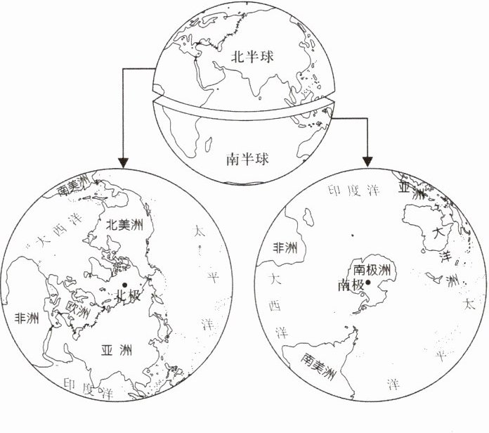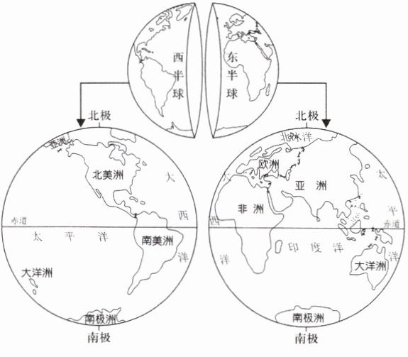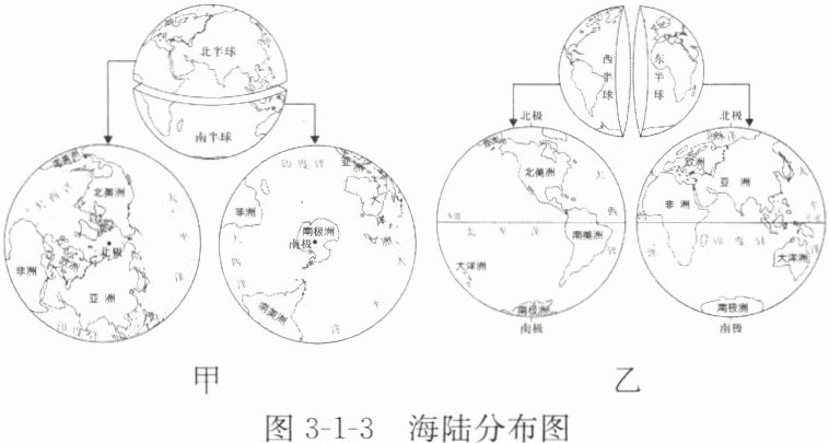 ,海洋主要分布在南半球,即陆地面积北半球比南半球大(图甲)。(2) 从东、西半球看,陆地主要集中在
