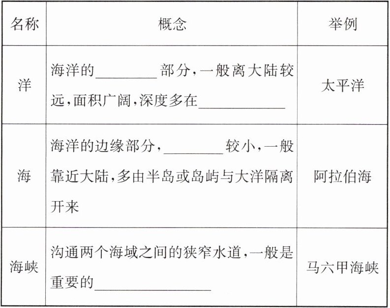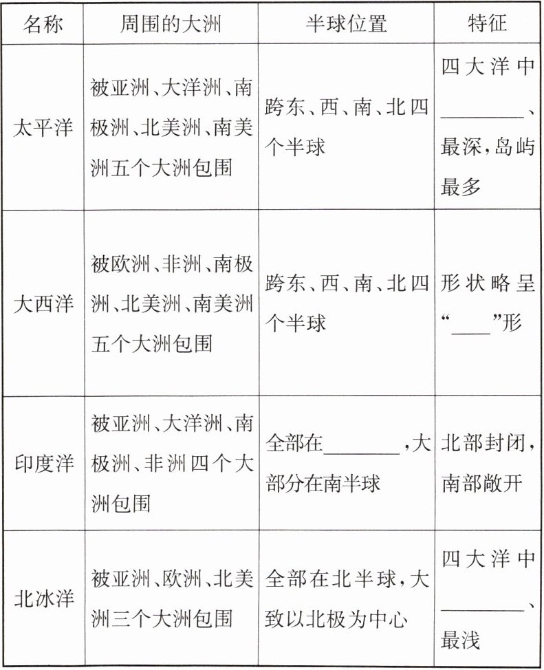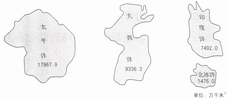 1.太平洋 大西洋 印度洋 北冰洋 2.最大 S 东半球 最小 3.主体 2000米以上 面积 海上通道