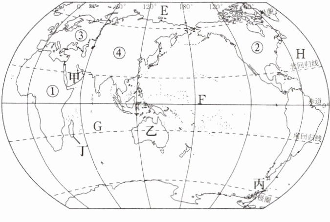 3. A 【解析】半岛是大陆向海洋延伸的部分,三面环海。由图可知,图中甲是半岛,乙是大陆,丙是海峡,丁是岛屿。故选 A。4. C 【解析】$20^{\circ}W$以东、$160^{\circ}E$以西为东半球。由图可知,在四大洋中,几乎全部位于东半球的大洋是图中的 G,即印度洋。故选 C。5. D 【解析】由图可知,②是北美洲,④是亚洲,②和④的分界线是白令海峡。故选 D。