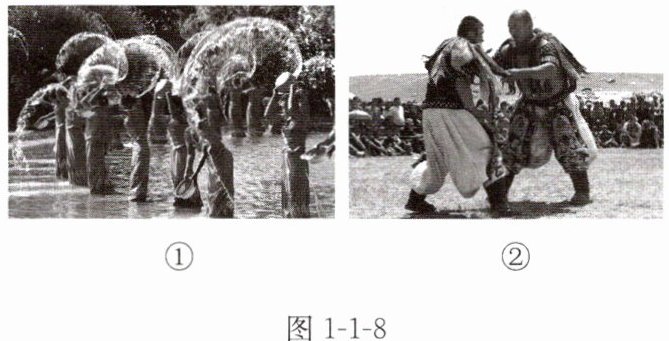 的环境有关。(5) 图1-1-8中的②为我国蒙古族的摔跤,蒙古族擅长骑射、摔跤,与当地平坦广阔的
