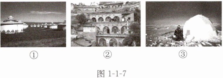 (1) 图1-1-7中的①民居是我国蒙古族的蒙古包,它便于拆装,非常适合在