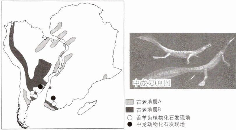 [2024·江苏徐州铜山区期中]考古学家们认为,中龙是生活在古生代的一种淡水爬行动物,其化石仅发现于非洲和南美洲。图3-ZM-8为南美洲和非洲的古老地层及动、植物化石相似性示意图。据此回答11、12题。