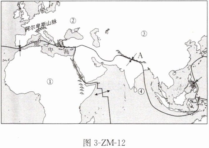 [2024·江苏徐州期中]世界上某些雄伟山脉的形成与板块运动有关。读图3-ZM-12,回答7~9题。