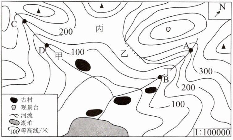 4. D 【解析】图示区域海拔较低,均在 500 米以下,地面有起伏,坡度和缓,所以主要地形类型是丘陵。故选 D。5. B 【解析】甲地位于山谷,乙地位于陡崖,丙地地形平坦,丁地位于山谷。乙地位于陡崖,易被滚落的碎石砸伤,最有可能发现“小心落石”标志。故选 B。6. B 【解析】图中有指向标,按照指向标来判断方向,AB 河段自北向南漂流,该河段等高线较密集,坡度较陡,流速更快,B正确,A错误;CD 河段大致自西向东漂流,该河段等高线较稀疏,坡度较缓,流速较慢,C、D错误。故选 B。