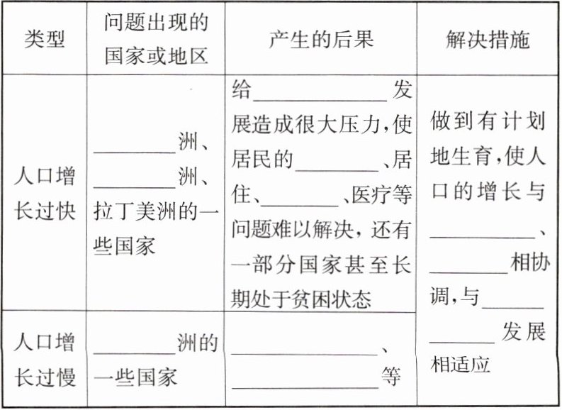 1.增长 2.亚 非 社会经济 就业 教育 资源 环境 社会经济 欧 劳动力短缺 养老负担过重