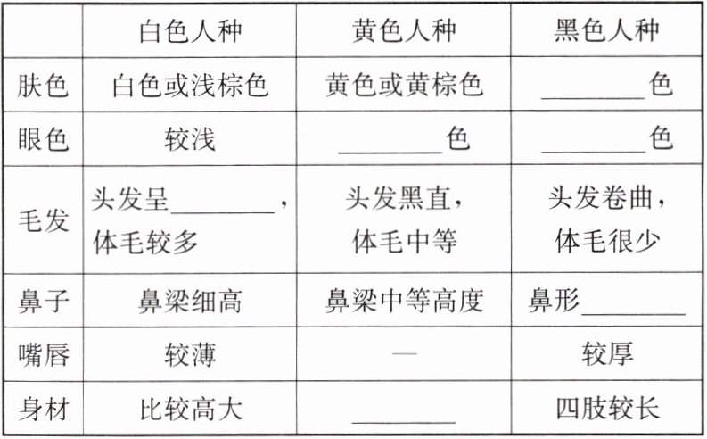 (1)划分依据:人类______的特征。其中,______是划分人种的重要标志。