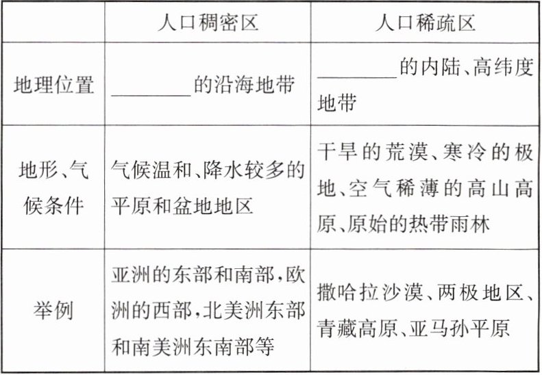 2. 分布特点:世界人口的地理分布很不均匀,有的地方人口______,有的地方人口______。