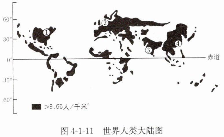 邦奇等著名学者为了揭示世界人口的分布状况,创建了人类大陆图,即在地图上取消陆地和海洋,仅画出人口密集的地区,面积较大的人口密集区称人类大陆。世界上共存在四个人类大陆,分别是东亚和东南亚大陆、南亚大陆、欧洲大陆、北美东部大陆。图4-1-11为世界人类大陆图。据此回答3、4题。