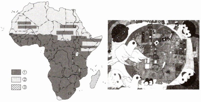人种是指在体质、外表上具有某些共同遗传特征的人群。不同人种的人都为人类文明和社会进步作出过巨大贡献。图4-1-12为某大洲人种分布图及儿童绘画作品。读图,回答5、6题。