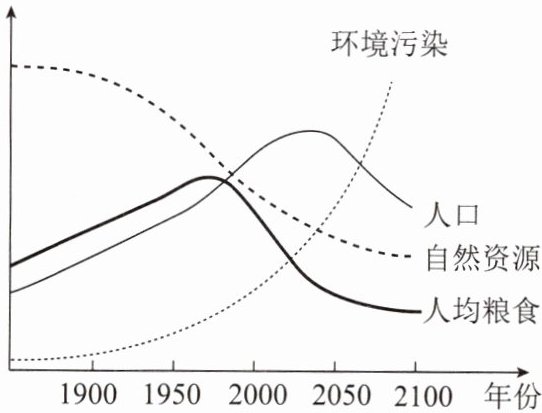 9.B【解析】读图可知,随着时间的变化,人口数量先增加后减少,环境污染不断加重,人均粮食占有量先上升后降低,自然资源数量持续减少。故选B。 10.B【解析】人口激增会带来很多问题,如土地资源利用过度、人均粮食占有量持续下降、自然资源枯竭、环境污染加重、人口大量死亡乃至停止增长等。故选B。
