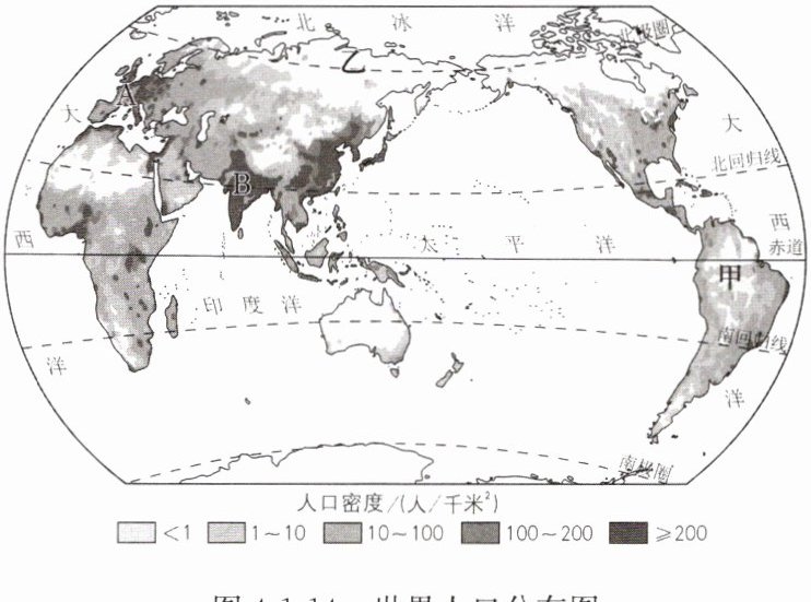 11. 读世界人口分布图(图4-1-14),回答下列问题。(9分)