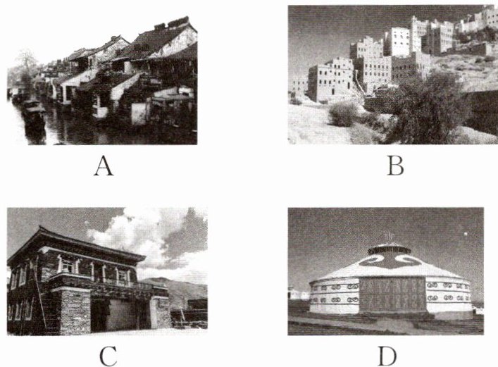 7. 一个地区的干湿状况会影响当地的建筑。下列四种民居位于湿润地区的是 (
