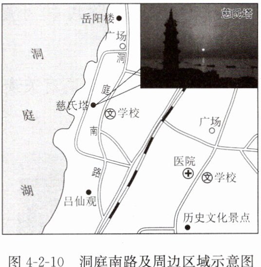 11. 洞庭南路历史文化街区,是岳阳市旧城提质改造重点建设项目,主要包括街区老旧小区的改造、交通生活设施建设、历史文物建筑的修缮等。改造后,这里将成为市民休闲旅游的好去处。读洞庭南路及周边区域示意图(图4-2-10),回答下列问题。(5分)