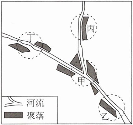 10. D【解析】从图中可以看出,受河流因素影响,乡村聚落多分布在河流两岸,总体形态呈带状。故选D。11. A【解析】从图中可以看出,甲、乙、丙、丁四地最有可能发展为城镇的是甲地,因为甲地地形平坦,交通便利,处于河流的交汇处。故选A。