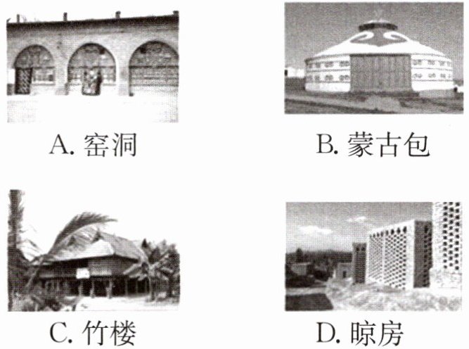 )A. 窑洞 B. 蒙古包 C. 竹楼 D. 晾房