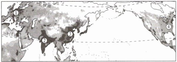 4. 读世界四大人口密集区分布示意图(图 4-ZM-11),①②③④中,以黄色人种为主的是(
