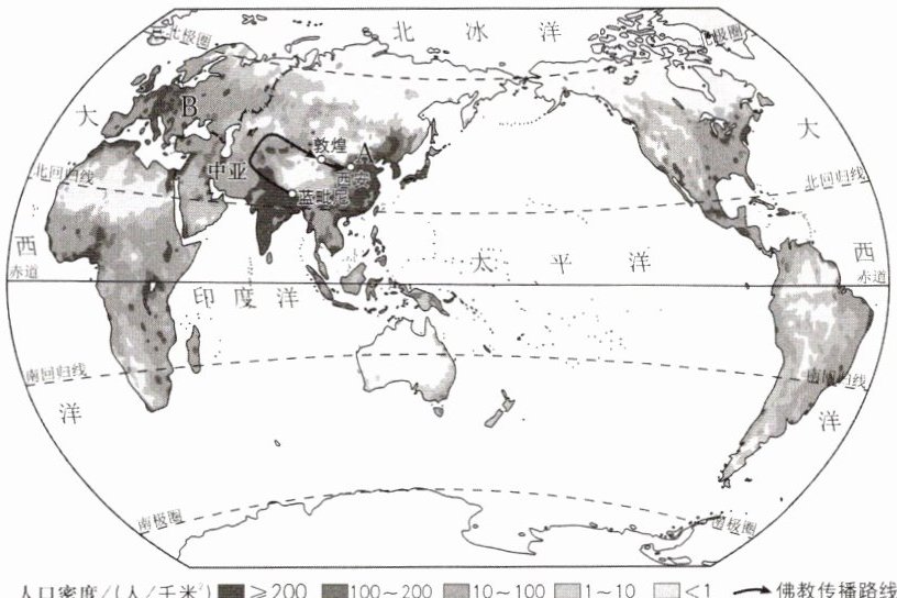 (1)世界人口分布很不均衡,其中人口密度>100 人/千米$^2$的地区主要位于
