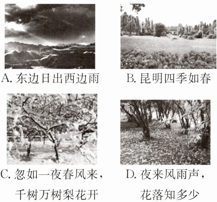 B 【解析】天气是指某个地方距离地表较近的大气层在短时段内的具体状态,突出特点是多变。气候是指一个地方多年的天气平均状况,它具有相对稳定性。"东边日出西边雨""忽如一夜春风来,千树万树梨花开""夜来风雨声,花落知多少"描述的都是天气状况,"昆明四季如春"描述的是气候。故选 B。