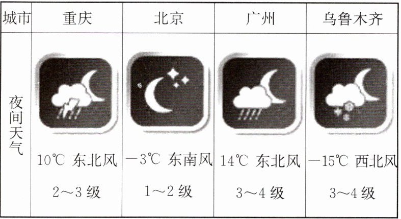 6. B 【解析】读图可知,40°N附近的天气符号是西北风6级和沙尘暴,表明40°N附近地区会出现沙尘暴、大风天气。故选 B。 7. C 【解析】读图可知,30°N附近的天气符号是中雨,所以人们出行要带好雨具。故选 C。 8. D 【解析】汽车尾气影响空气质量,汽车越多,尾气排放就越多,空气质量也就越差。故选 D。