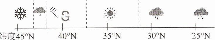 图5-1-4为某日我国东部一条经线附近地区的天气状况示意图。读图,回答6~8题。