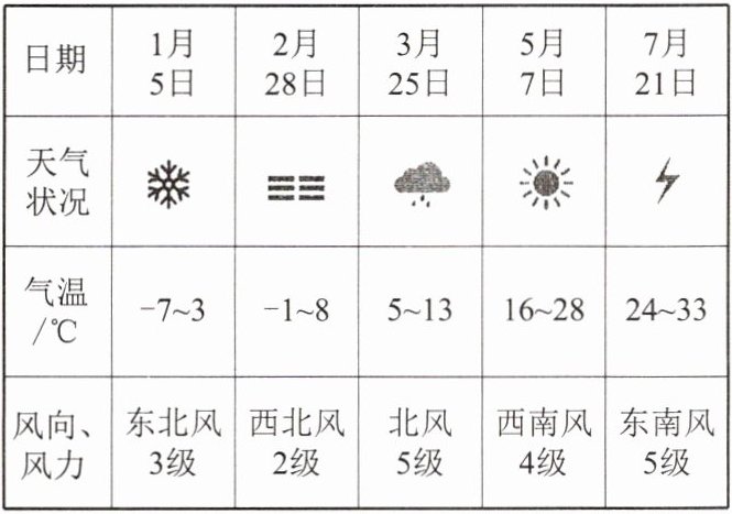 ℃。(2)天气情况记录表中,有雷电天气的日期是