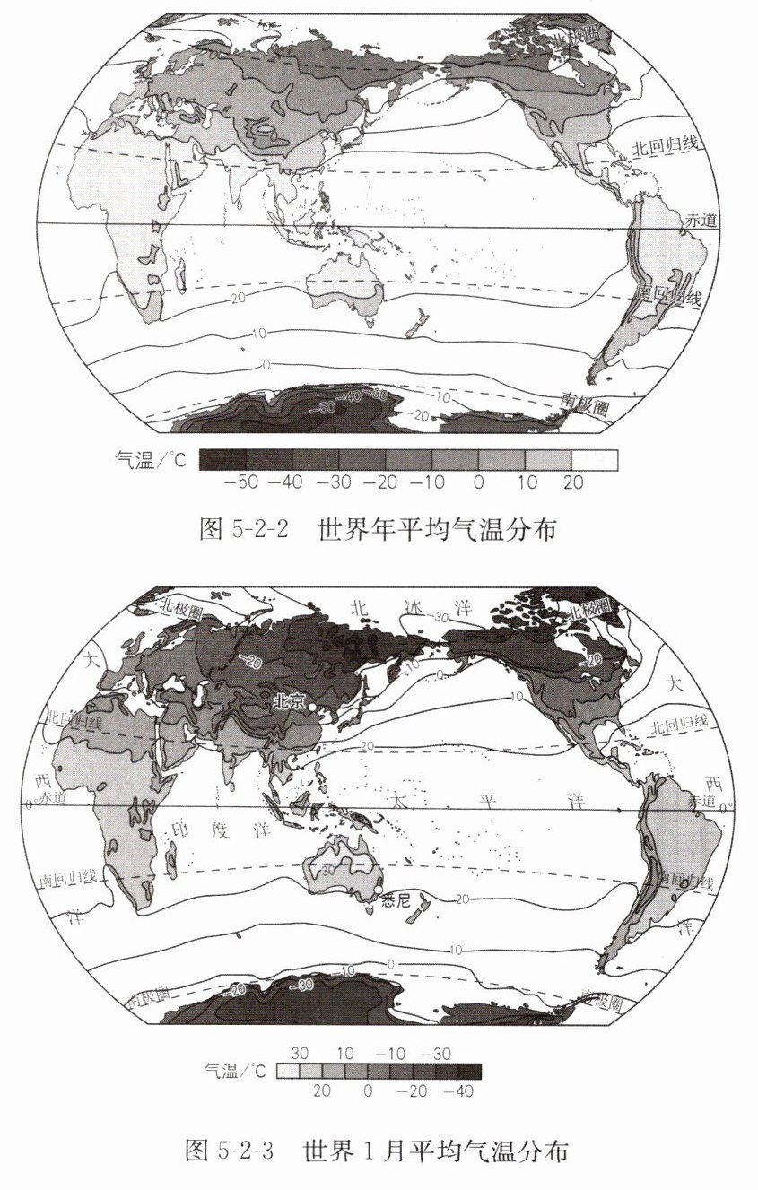 向两极气温逐渐降低。年平均气温大于20℃的地区大致位于南、北回归线