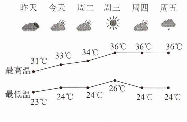 C 【解析】读图可知,昨天的天气是阴天,气温日较差为31-23=8℃,A错误。周二的气温日较差为34-24=10℃,周四、周五的气温日较差都是36-24=12℃,B错误。周三的天气是晴天,最低气温26℃,C正确。测量旗杆影子长度在一天中的变化,宜选择在晴朗的周三,D错误。故选C。