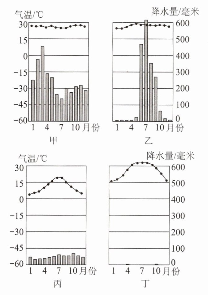 13.B 【解析】读图可知,甲地全年多雨;乙地6—9月降水多,其他月份降水少,降水季节变化大;丙地全年降水均匀;丁地全年少雨。故选B。 14.D 【解析】读图可知,丁地全年高温少雨。故选D。