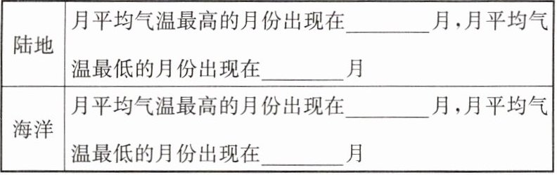 (1)同纬度地区:夏季,陆地气温______,海洋气温______;冬季,陆地气温______,海洋气温______;从沿海到内陆,气温年较差逐渐______。