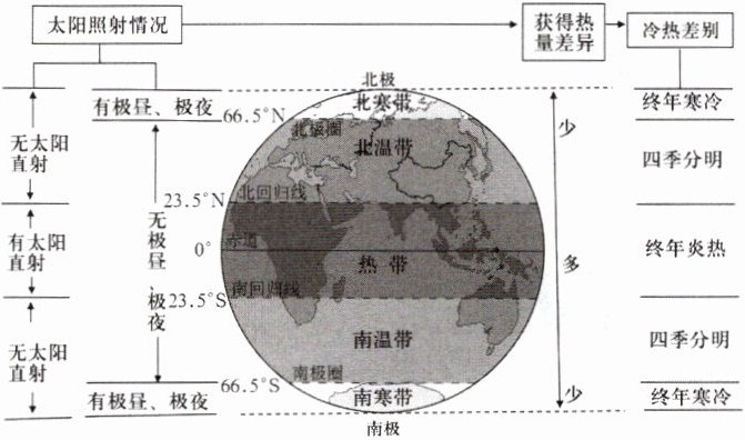 6. 五带的划分:人们根据各地获得______的多少,以及是否有太阳光线的______照射、是否有______和______现象,将地球表面划分为“五带”,即热带、北(南)温带、北(南)寒带。