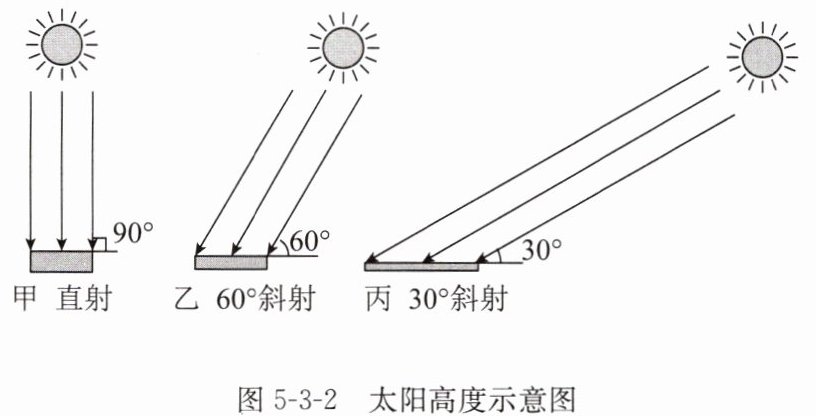 3. 太阳高度与纬度的关系:太阳光线垂直照射的地方,太阳辐射______。当太阳光线垂直照射赤道时,随着纬度的增加,太阳光线与地平面的夹角______,一定面积的地表所吸收的太阳辐射也逐渐______。