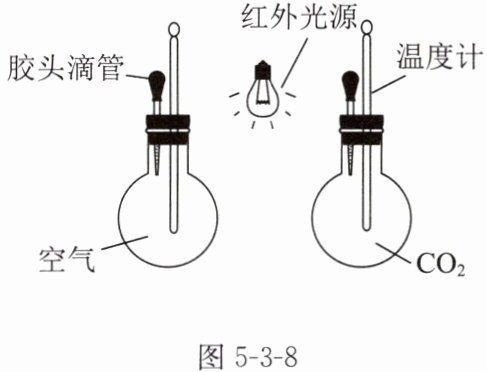 小实验:在两只烧瓶里分别充满$CO_2$和空气,塞紧带有温度计和胶头滴管的橡皮塞。再把两只烧瓶放在红外线下照射,观察温度升高的情况(如图5-3-8所示)。结论:两烧瓶在相同光线照射下,装有$CO_2$烧瓶的温度比装有空气烧瓶的温度高。据此回答9~11题。