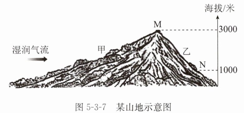 [2024·江苏徐州邳州明德中学阶段检测]高大山脉对气流的阻挡作用造成山脉两侧降水的差异,“一山有四季”体现了海拔高低导致气温的不同。读某山地示意图(图5-3-7),回答7、8题。