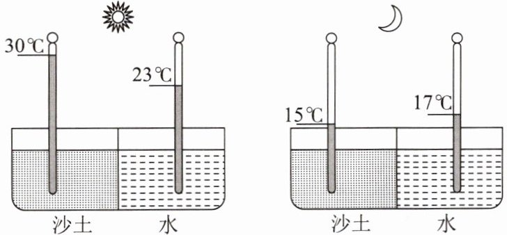 3.B 【解析】读图可知,白天沙土的温度比水的温度高,晚上沙土的温度比水的温度低,这反映了海陆分布对气温的影响。故选B。 4.C 【解析】图中沙土代表陆地,水代表海洋,形象地演示了海陆分布对气温的影响,与纬度和地势无关,A、B错误;示意图反映了陆地的气温日较差大于海洋,C正确;图中只有一天的数据,反映的是日较差,D错误。故选C。