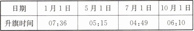 北京天安门广场上的国旗,每天伴着日出而升起,随着日落而降下。下表是北京某中学的学生记录的某年四个节日升国旗的时间,据此回答1、2题。