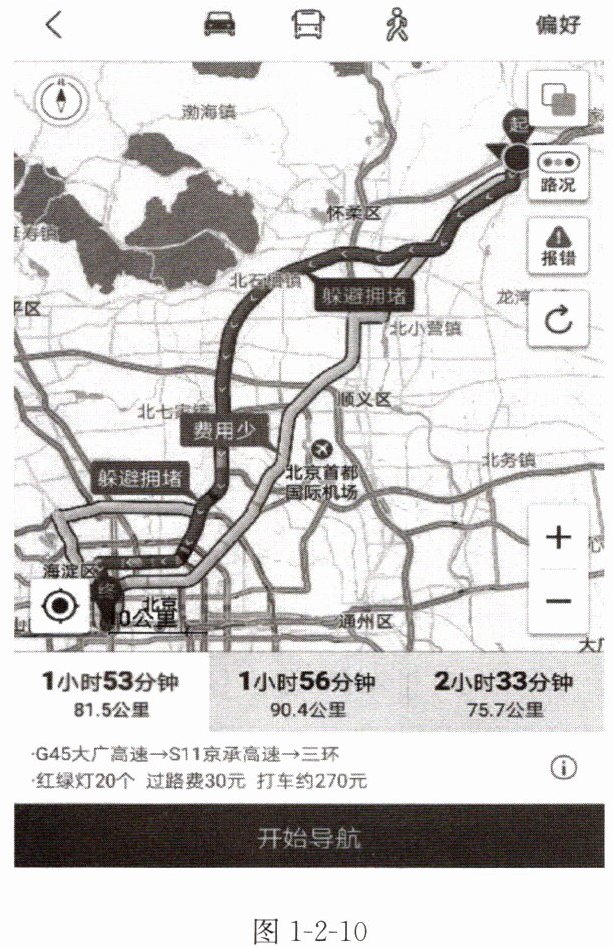 近几年,不少同学参加了“走进国家博物馆”“走进首都博物馆”的社会大课堂实践活动。出发前,中学生小辉用手机查阅地图,通过输入起点和终点可以查阅行走路线和距离,还可通过放大和缩小地图,查询到更多信息,如图1-2-10所示。读图,回答6~8题。